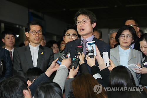 | △ 기자회견하는 조희연 서울시교육감 (서울=연합뉴스) 박지호 기자 = 지난해 서울시 교육감 선거에서 상대 후보인 고승덕 변호사의 미국 영주권 보유의혹을 제기한 혐의로 기소된 조희연 서울시교육감이 23일 오후 서초동 서울중앙지법에서 열린 국민참여재판 1심 선고공판에서 유죄판결을 받은 뒤 기자회견을 하고 있다. 2015.4.23 jihopark@yna.co.kr |