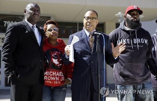 | △ 지난해 미국 미주리 주 퍼거슨 시에서 백인 경관의 총격에 사망한 흑인 청년 마이클 브라운의 부모와 변호인이 23일(현지시간) 시를 상대로 손해배상 청구 소송을 제기한 뒤 기자회견을 하고 있다. |