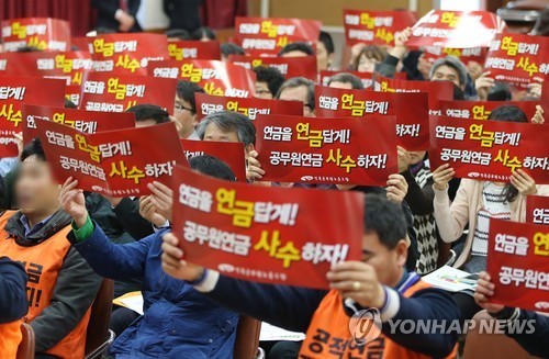 | △ 구호 외치는 전국공무원노조 조합원들 (서울=연합뉴스) 김주성 기자 = 전국공무원노조 조합원들이 24일 오전 서울의 한 행정기관에서 조합원 총회를 여는 방식으로 민주노총 총파업에 참여, 공무원연금 개혁에 반대하는 피켓을 들고 구호를 외치고 있다. |
