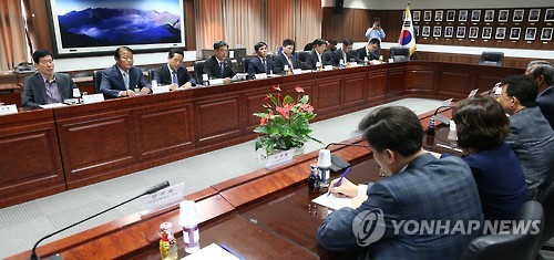 | △ 통일부 개성공단 기업대표단과 면담 (서울=연합뉴스) 황광모 기자 = 개성공단 임금지급 시한인 24일 오후 서울 세종로 정부서울청사 내 통일부 회의실에서 황부기 통일부 차관과 개성공단 입주기업 대표단이 만나 의견을 나누고 있다. 2015.4.24 hkmpooh@yna.co.kr |