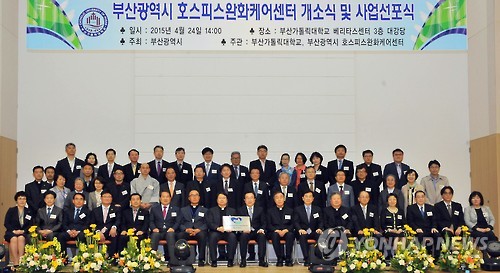 | △ 부산서 전국 첫 공공형 생애 말기 돌봄 서비스 (부산=연합뉴스) 24일 부산가톨릭대에서 열린 '호스피스 완화 케어센터' 개소식에 참석한 주요 인사들이 기념촬영을 하고 있다. 2015.4.24 << 부산시 제공 >> youngkyu@yna.co.kr |