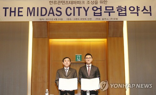 | △ 충주시·유빛 '마이다스 시티' 업무협약식 (영종도=연합뉴스) 윤태현 기자 = 조길형 충주시장(왼쪽부터)과 애드먼드 김 ㈜유빛 대표가 24일 오후 인천시 중구 그랜드 하얏트 인천 호텔에서 열린 '한류콘텐츠테마파크 조성을 위한 더 마이다스 시티(The Midas City) 업무협약식'에서 협약을 체결한 뒤 기념촬영을 하고 있다. 2015.4.24 tomatoyoon@yna.co.kr |