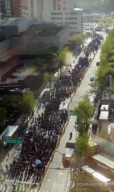 | △ 민주노총 총파업 결의대회 행진 (서울=연합뉴스) 신준희 기자 = 24일 오후 서울광장에서 민주노총 총파업 결의대회를 마친 집회 참가자들이 행진을 하고 있다. 2015.4.24 hama@yna.co.kr |