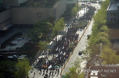 | △ 민주노총 총파업 결의대회 행진 (서울=연합뉴스) 신준희 기자 = 24일 오후 서울광장에서 민주노총 총파업 결의대회를 마친 집회 참가자들이 행진을 하고 있다. 2015.4.24 hama@yna.co.kr |