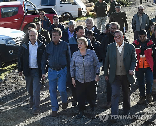 | △ 칼부코 화산 인근 지역 방문한 칠레 대통령 (푸에르토몬트<칠레> EPA=연합뉴스) 미첼 바첼레트 칠레 대통령(가운데)이 23일(현지시간) 남부 칼부코 화산이 폭발 조짐을 보임에 따라 비상사태가 선포된 푸에르토몬트 지역을 둘러보고 있다. 수도 산티아고에서 1천300㎞ 떨어진 푸에르토 몬트 시와 푸에르토바라스 시에서는 화산이 내뿜는 화산재와 연기 때문에 학교 수업이 중단됐고 항공기 운항이 금지됐다. 2010596@yna.co.kr |