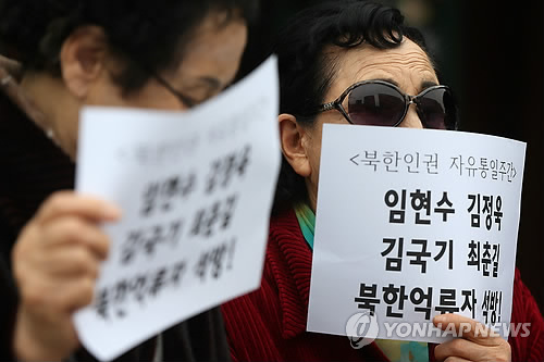 | △ '북한 억류자 석방 촉구 기독교시민단체협의회' 소속 회원들이 지난달 31일 오전 서울 종로구 탑골공원 앞에서 기자회견을 열고 최근 북한 당국에 체포된 김국기, 최춘길씨와 억류된 임현수 목사, 김정욱 선교사를 석방해줄 것을 촉구하고 있다. 2015.4.25.<<연합뉴스DB>> |