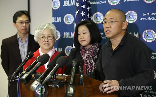 | △ 미국 국무부가 지난 23일(현지시간)자로 북한 여행경보를 다시 발령했다. 사진은 북한에 억류됐다가 2년만에 석방된 한국계 미국인 케네스 배(46, 오른쪽)씨가 지난해 11월 8일(현지시간) 워싱턴주 매코드 공군기지에 도착, 기자회견하고 있다. (AP=연합뉴스) |