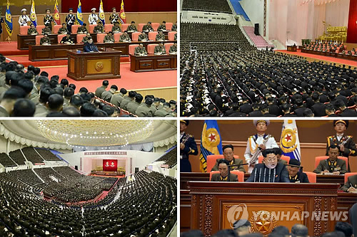 | △ 북한, 조선인민군 제5차 훈련일꾼대회 개최 (서울=연합뉴스) 북한 노동당 기관지 노동신문은 26일 "경애하는 최고사령관 김정은 동지의 지도 밑에 24~25일 평양에서 조선인민군 제5차 훈련일꾼대회를 성대히 진행했다"고 보도했다. 김정은 제1위원장은 연설에서 "오늘 인민군대 앞에 나서는 가장 중요하고 절박한 과업은 당의 전략적 의도에 맞게 전투준비를 완성하는 것"이라고 당부했다. 사진은 대회장 모습.2015.4.26 nkphoto@yna.co.kr |
