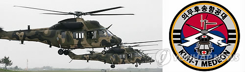 | △ 육군 의무후송항공대 출범 (서울=연합뉴스) 육군이 군내 응급환자의 신속한 후송을 전담하는 의무후송항공대를 다음달 1일 공식 창설한다. 의무후송항공대는 최신 기동헬기인 수리온(KUH-1) 6대를 갖추게 된다. 왼쪽은 수리온, 오른쪽은 의무후송항공대 부대마크. 2015.4.27 photo@yna.co.kr |