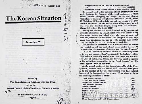 미국 뉴욕 맨해튼의 뉴욕한인교회 창고에서 최근 발견된 '한국의 상황'(The Korean Situation) 이라는 제목의 27페이지짜리 문서에는 1919년 3·1운동 이후부터 이듬해 3월까지 한국인들이 벌인 독립운동을 소개하고 일본의 무자비한 진압 상황이 담겨 있다.