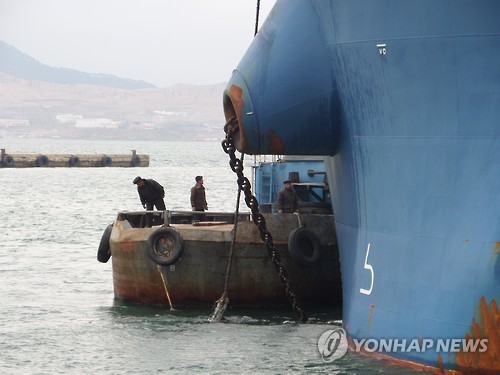| △ '나진-하산 프로젝트' 2차 시범운송 출항 준비 (서울=연합뉴스) 러시아산 유연탄을 북한을 거쳐 가져오는 나진-하산 프로젝트의 2차 시범운송 일정이 안개 때문에 다소 지체되고 있다고 통일부가 밝혔다. 이 프로젝트는 러시아산 유연탄을 러시아 하산과 북한 나진항을 잇는 54㎞ 구간 철도로 운송한 뒤 나진항에서 화물선에 옮겨 실어 국내 항구로 가져오는 남·북·러 복합물류 사업이다. 사진은 '나진-하산 프로젝트' 2차 시범운송 현장점검단이 공개한 것으로 화물선 출항을 위해 예인작업 준비하는 모습. 2015.4.24 << 통일부 제공 >> photo@yna.co.kr |