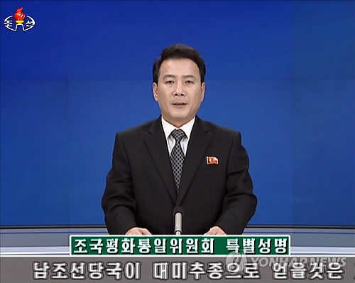 | △ 북한 조평통 "남한, 미국 추종하면 보복타격 대상" (서울=연합뉴스) 북한의 대남기구인 조국평화통일위원회는 11일 남한이 미국의 대북압박 정책에 동조하면 '보복 대상'이 될 것이라고 위협했다. 조평통은 이날 발표한 '특별 성명'에서 "조미(북미)대결전에 부나비처럼 뛰어든다면 남조선도 미국과 함께 공멸하는 비참한 운명을 면치 못한다는 것을 명심해야 할 것"이라고 밝혔다고 조선중앙통신이 전했다. 성명은 남측이 미국과 매일 '북침전쟁모의판'을 벌려놓고 '북침전쟁의 하수인·돌격대'로 나서고 있다고 비난하며 "남조선 호전광들이 미국 북침전쟁의 대포밥으로 나선다면 우리의 보복타격의 과녁이 된다는 것을 숨기지 않는다"고 위협했다. 사진은 특별 성명을 낭독하는 조선중앙TV 아나운서 모습. 2015.2.11 nkphoto@yna.co.kr |