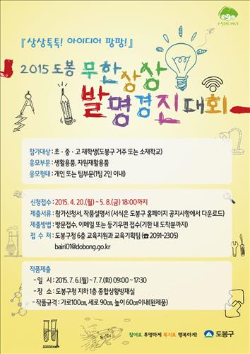 (서울=연합뉴스) 황희경 기자 = 서울 도봉구(구청장 이동진)는 구내 초·중·고등학교 학생을 대상으로 '2015 도봉 무한 상상발명경진대회'를 연다고 28일 밝혔다.