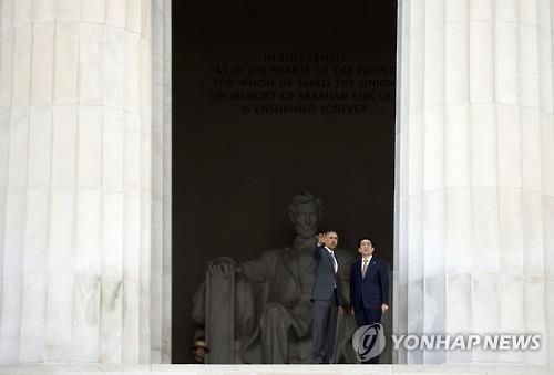 (워싱턴=연합뉴스) 심인성 특파원=미국을 방문 중인 아베 신조 일본 총리와 버락 오바마 미국 대통령이 27일(현지시간) 링컨 기념관을 깜짝 방문했다.