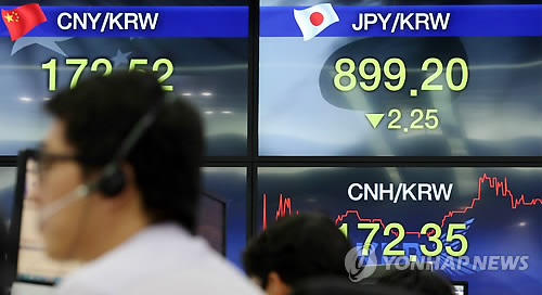 | △ 원-엔 환율 장중 900원선 아래로 (서울=연합뉴스) 홍해인 기자 = 원·엔 환율이 28일 장중 100엔당 800원대에 진입했다. 장중에 공식적인 원·엔 재정환율이 800원대에 들어선 것은 7년 2개월 만에 처음이다. 사진은 이날 오전 서울 을지로 외환은행 본점 딜링룸. |