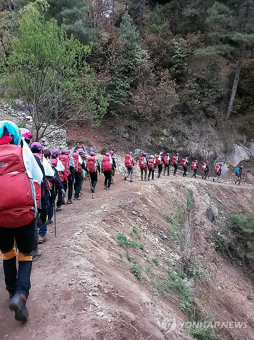 | △ 네팔 등정 '경기도 줌마탐험대' 전원 무사 (수원=연합뉴스) 대지진이 발생한 네팔 칼라파타르산(5천550m) 등정에 나섰던 '2015 경기도 줌마탐험대' 31명은 모두 무사, 한국 시간 27일 팍딩(2천500m) 지점까지 하산한 것으로 알려졌다. 사진은 줌마탐험대가 지진 발생 전 등정에 나서는 장면. 2015.4.27 << 경기도 제공 >> drops@yna.co.kr |