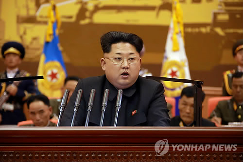 | △ 북한, 조선인민군 제5차 훈련일꾼대회 개최 (서울=연합뉴스) 24~25일 평양에서 열린 조선인민군 제5차 훈련일꾼대회에서 연설하는 김 제1위원장 모습을 북한 노동당 기관지 노동신문이 보도했다. 2015.4.26 nkphoto@yna.co.kr |