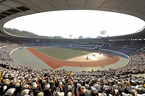 | △ 김일성경기장서 열린 北 남자 축구 경기 (평양 조선중앙통신=연합뉴스) 북한 김정은 국방위원회 제1위원장이 13일 김일성경기장에서 열린 만경대상체육경기대회 남자축구 선봉팀과 횃불팀의 경기를 관람했다고 조선중앙통신이 14일 전했다. 2015.4.14 photo@yna.co.kr |