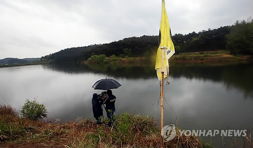 | △ 훈련중 군장교 2명 물에 빠져 (광주=연합뉴스) 박철홍 기자 = 28일 오후 광주 광산구 도덕동 지동저수지에서 장교 2명이 훈련 중 물에 빠져 의식불명상태다. 사진은 사고가 발생한 해당 저수지에 사고 위치를 뜻하는 깃발이 세워져 있는 모습. |
