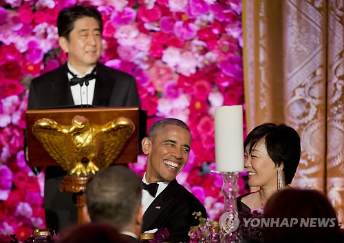 | △ 오바마와 아키에..백악관 '국빈만찬' (워싱턴 AP=연합뉴스) 28일(현지시간) 백악관 국빈만찬에서 버락 오바마 미국 대통령이 아베 신조(安倍晋三) 일본 총리의 부인 아키에(昭惠) 여사와 담소하고 있다. 연단에 아베 총리가 서 있다. kjw@yna.co.kr |