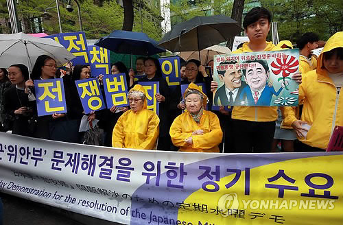 한국정신대문제대책협의회(정대협)는 일본군 위안부 피해자 김복동·길원옥 할머니와 시민 150여명이 참석한 가운데 빗속 집회를 열고 "아베 총리는 연설에서 식민지배와 일본군성노예 등 전쟁범죄 책임을 공식 인정하라"고 촉구했다.