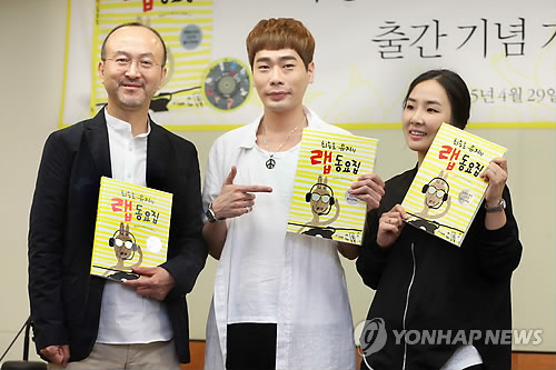 | △ '최승호·뮤지의 랩 동요집' 출간 기자간담회 (서울=연합뉴스) 김수진 기자 = 29일 오전 서울 중구 정동 프란치스꼬 회관에서 열린 '최승호·뮤지의 랩 동요집' 출간 기념 기자 간담회에 참석한 최승호 시인(왼쪽부터), 가수 뮤지, 성우 박지윤이 동요집을 들어보이고 있다. 2015.4.29 ksujin@yna.co.kr |