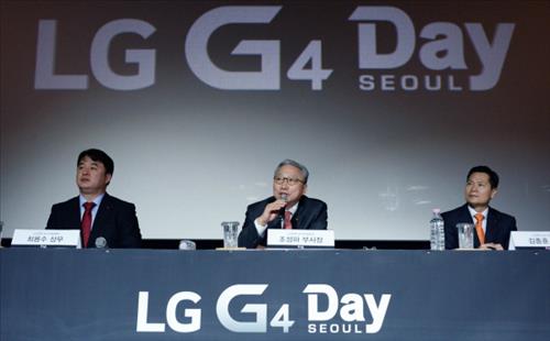 | △ LG전자 MC한국영업FD담당 조성하 부사장(가운데)이 29일 서울 코엑스에서 열린 LG G4 공개행사에서 질문에 답변하고 있다. |