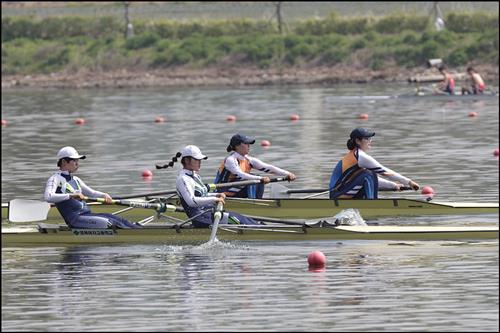 | △ 제4회 충주 탄금호배 전국조정대회에 출전한 여자 무타페어 선수들이 노를 젓고 있다. <<대한조정협회 제공>> |