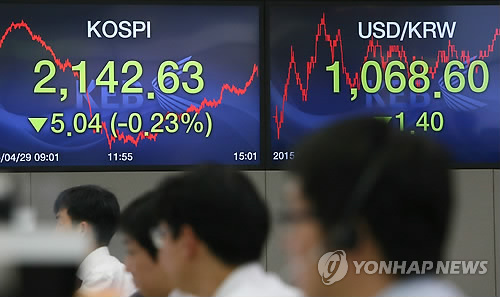| △ 코스피 나흘 연속 하락, 원·달러 환율 1.4원 내려 (서울=연합뉴스) 박지호 기자 = 코스피가 29일 외국인과 기관의 동반 순매도에 4거래일 연속 하락했다. 이날 코스피는 전날보다 5.04포인트(0.23%) 내린 2,142.63으로 마감했다. 한편 서울 외환시장에서 원·달러 환율은 달러당 1.4원 내린 1,068.6원으로 마감했다. 사진은 29일 오후 서울 을지로 외환은행 본점 딜링룸의 모습. |
