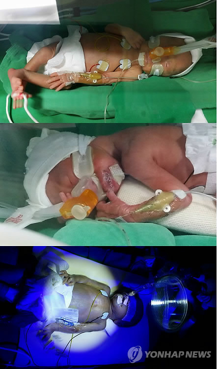 | △ (부산=연합뉴스) 부산시 해운대구 반송동에 사는 황복덕(37) 씨 부부 사이에서 태어난 세쌍둥이가 병원 인큐베이터에서 지내고 있다. 사진 위에서부터 큰딸 황지유, 둘째딸 지원, 막내 지한. 2015.4.27 <<황복덕 씨 제공>> ccho@yna.co.kr |