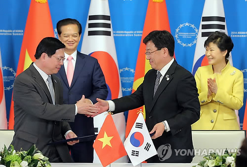 | △ <한-아세안>한-베트남FTA, 28개월만에 타결 (부산=연합뉴스) 이정훈 기자 = 윤상직 산업통상자원부 장관과 부휘황 베트남 산업무역부 장관이10일 오후 부산 해운대구 한 호텔에서 박근혜 대통령과 응웬 떤 중 베트남 총리의 공동 기자회견에 앞서 양국 FTA 실질 타결 합의 의사록에 서명한 뒤 악수하고 있다. 2014.12.10 uwg806@yna.co.kr |