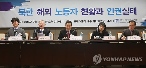 | △ 북한 해외 노동자 현황과 인권실태 (서울=연합뉴스) 김주성 기자 = 지난 10일 오후 서울 중구 프레스센터에서 열린 '북한 해외 노동자 현황과 인권실태' 토론회에서 정재호 북한인권정보센터 박사(왼쪽에서 두번째)가 '북한 해외 노동 실태에 대한 정책 제언'을 주제로 발표하고 있다. 2015.4.30 utzza@yna.co.kr |