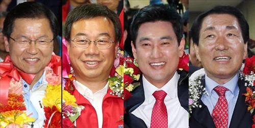 | △ 천정배 신상진 오신환 안상수 당선 (광주=연합뉴스) 4·29 재보선에서 당선된 광주 서구을 무소속 천정배 후보(왼쪽부터)와 새누리당 경기 성남 중원 신상진, 서울 관악을 오신환, 인천 서구강화을 안상수 후보. |