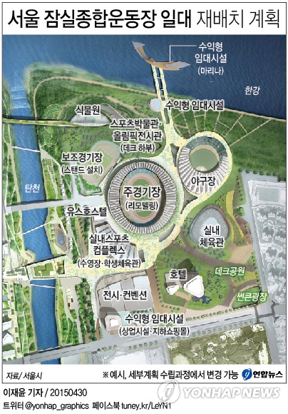 | △ <그래픽> 서울 잠실종합운동장 일대 재배치 계획 (서울=연합뉴스) 이재윤 기자 = 서울시는 30일 코엑스∼잠실종합운동장 지역에 조성되는 국제교류복합지구 중 잠실운동장 일대 공공부지 개발 가이드라인을 내놓고 개발 아이디어 발굴을 위한 국제공모에 나섰다. yoon2@yna.co.kr |