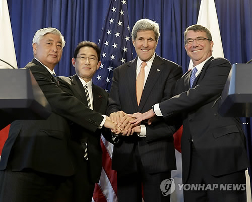 | △ 미국과 일본은 지난 27일(현지시간) 외교·국방장관 연석회의(2+2)를 열고 미군과 자위대의 공동 행동 반경을 종전의 '일본 주변'에서 전세계로 확대하는 내용과 함께, 양측간 상시 조정 기구를 설치하는 내용 등을 담은 새 미·일 방위협력지침(가이드라인)을 확정했다.(AP=연합뉴스 자료사진) |