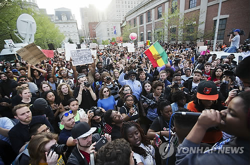 | △ '그레이 사망' 볼티모어 연일 시위 (볼티모어 AP=연합뉴스) 경찰 구금중 숨진 프레디 그레이의 사망사건에 항의하는 시위가 29일(현지시간)에도 볼티모어 등지에서 이어졌다. 수백명의 시위자들은 신속한 정의 실현을 요구하며 시내를 행진했다. |