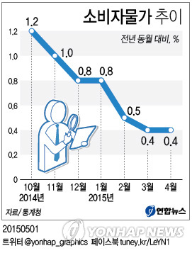 통계청이 1일 발표한 한국의 4월 소비자물가는 지난해 같은 달보다 0.4% 올랐다.