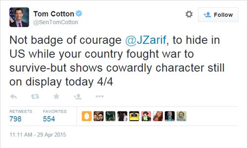 코튼 의원의 트윗이 게시된 지 1시간 반 정도 뒤 자리프 장관도 트위터를 통해 "우리에게 필요한 건 남자라고 으스대는 개인적 비방이 아닌 신중한 외교가 필요한 것"이라고 응수했다.