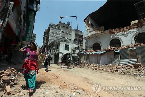 | △ (카트만두<네팔>=연합뉴스) 신준희 기자 = 1일 오전(현지시간) 네팔 지진으로 전쟁터 같이 변한 카트만두 시내를 한 주민이 걸어가고 있다. 2015.5.1 |