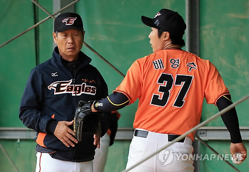 (대전=연합뉴스) 신창용 기자 = 프로야구 한화 이글스의 김성근(73) 감독은 5월의 키 플레이어로 배영수(34)를 첫손에 꼽았다. 김 감독은 "배영수, 송은범, (미치) 탈보트가 확실하게 서야 한다. 그럴 때 상대와 싸움을 할 수 있다"고 말했다.