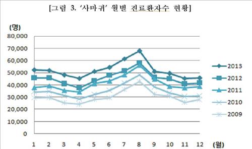 계절별로는 봄철에 진료인원이 늘어나 여름에 정점을 찍은 뒤 가을이 되면서 줄어드는 추세를 보였다.