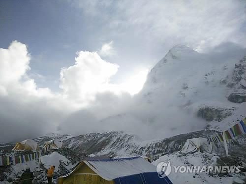 | △ 지난달 25일 발생한 대지진과 계속된 여진으로 에베레스트 서쪽 푸모리 산에서 눈사태가 일어나고 있다. 에베레스트 베이스 캠프에서 바라 본 모습이다.(AP=연합뉴스) |