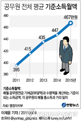 4일 행정자치부 등에 따르면 최근 관보에 고시된 '2015년도 공무원 전체의 기준소득월액 평균액'은 작년보다 4.5% 상승한 467만원이다.
