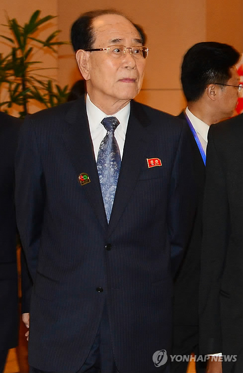 | △ 北김영남, 아시아-아프리카 정상회의 폐회식 참석 (서울=연합뉴스) 김영남 북한 최고인민위원회 상임위원장이 23일 오후(현지시각) 인도네시아 자카르타에서 열린 60주년 기념 아시아-아프리카 정상회의 폐회식에 참석, 회의장으로 이동하고 있다. 2015.04.24 << 교육부 제공 >> photo@yna.co.kr |