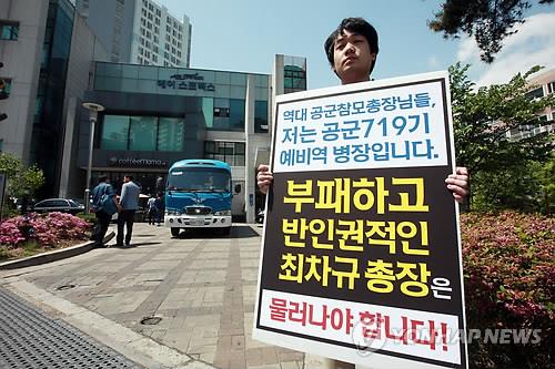 공군 719기 예비역 병장이라고 밝힌 서인혁(24)씨는 이날 오전 서울 대방동 공군회관 인근 공군 복지시설 에어스포렉스 앞에서 '부패하고 반인권적인 최차규 총장은 물러나야 합니다'라고 쓴 피켓을 들고 시위를 했다.