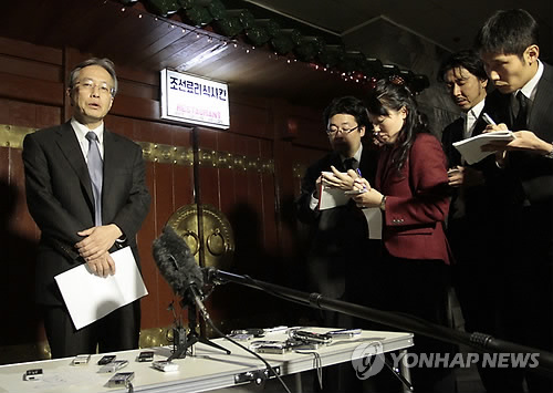 | △ 이하라 준이치 일본 외무성 아시아대양주국장이 지난해 10월 29일 북한 평양의 양각도 호텔에서 일본인 납북자 문제와 관련해 기자회견을 하는 모습.2015.5.4.<<연합뉴스 DB>> Junichi Ihara, left, director general of the Asia and Oceania Affairs Bureau of Japan's Foreign Ministry, speaks during a press conference at Yanggakdo Hotel in Pyongyang, North Korea, Wednesday, Oct. 29, 2014 The second and final day of talks was underway Wednesday between North Korean and Japanese officials assessing progress into an investigation of the fates of Japanese citizens abducted by North Korea in the 1970s and '80s. (AP Photo/Kim Kwang Hyon) |