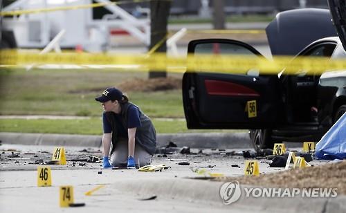 | △ 미국 경찰이 4일(현지시간) 미국 텍사스 주 갈랜드의 무함마드 만평 전시회장에서 사살된 용의자의 차량 주변에 증거 표식을 설치하고 수사하고 있다. 남성 용의자 2명은 전날 오후 행사장 주변에서 총격을 가하다가 경찰의 대응사격으로 그 자리에서 사망했다. (AP=연합뉴스) |