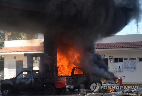 | △ 지난 1일(현지시간) 멕시코 할리스코 주 과달라하라 시의 주유소에서 방화가 발생해 차량이 불타고 있다.(EPA=연합뉴스DB) |