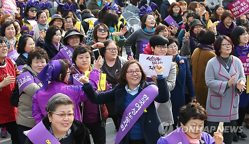 | △ 성평등 사회를 바라는 흥겨운 춤판 (서울=연합뉴스) 김도훈 기자 = 8일 오후 서울 광화문광장에서 열린 '3·8 세계여성의 날 기념식'에서 참가자들이 성평등 사회 구현을 기원하며 춤을 추고 있다. 2015.3.8 superdoo82@yna.co.kr |