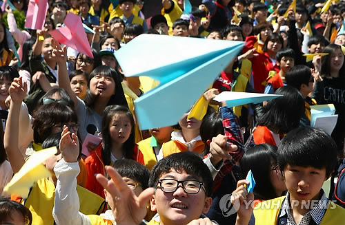 | △ '실종아동안전귀가·학교폭력없는세상 소망하며' (서울=연합뉴스) 박영서 기자 = 어린이날인 5일 오전 서울 청량리역 광장에서 열린 '제93회 어린이날 실종아동찾기 및 학교폭력·자살예방 캠페인'에서 참가자들이 소망을 적은 종이비행기를 날리고 있다. |
